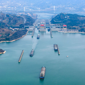 2026年1月1日,在湖北省宜昌市,船舶有序通过三峡双线五级船闸(无人机照片)。新华社发(王罡摄)