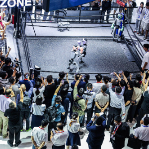 2025年9月25日,在第四届全球数字贸易博览会数智未来主题展区的杭州六小龙专区,观众观看宇树科技的人形机器人进行格斗擂台赛。新华社记者 徐昱 摄