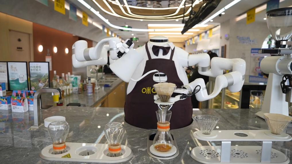 午后,再享受喝一杯咖啡的惬意时光。在街角,有一家不同寻常的咖啡店。吧台前,一位机器人“咖啡师”熟练地磨咖啡粉、冲泡咖啡,做得有模有样。