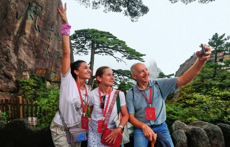 境外游客在黄山风景区的迎客松前自拍留念(2024年9月12日摄)。新华社发(施亚磊摄)