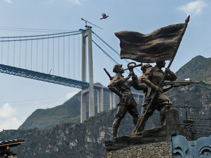 这是2025年4月28日拍摄的贵州花江峡谷大桥。9月28日,新的世界第一高桥——贵州花江峡谷大桥建成通车。近处的则是一座建于1898年、由14根铁链组成的花江铁索桥。1935年4月,中央红军右路纵队挺进黔西南,死守花江铁索桥这一战略要冲,确保红军主力顺利抢渡北盘江。新旧两座桥,横跨着百年历史风云,见证着血与火的艰辛历程。