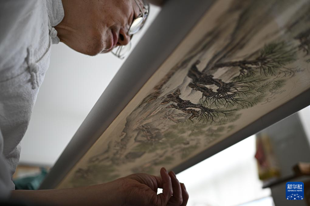 6月6日,在东台嘉丽发绣厂,东台发绣传承人陈伯余用颜料勾画样稿。这一环节是发绣的前置,称为“勾绷落样”。