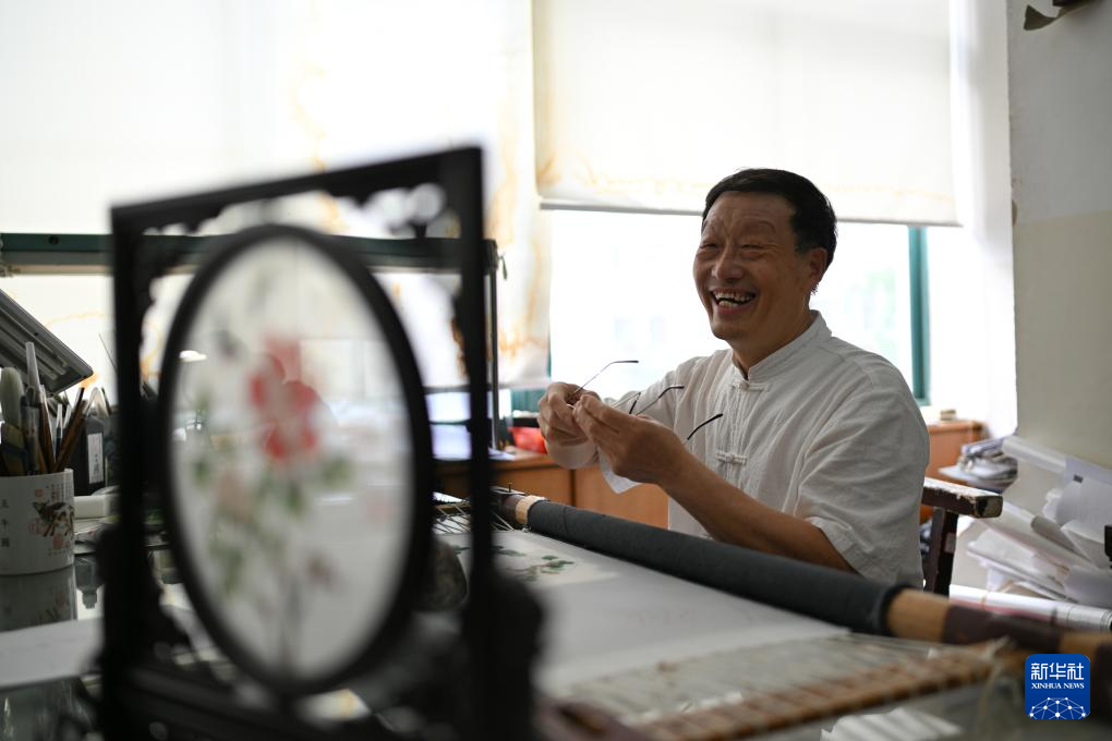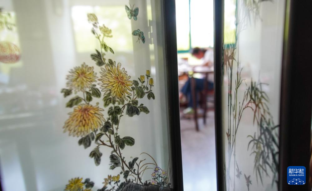 6月6日,在东台嘉丽发绣厂,东台发绣传承人陈伯余工作前擦拭眼镜。