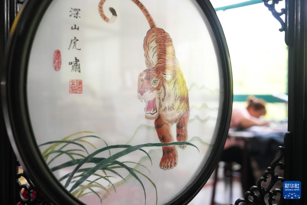 6月6日,在东台西溪天仙缘景区内的东台发绣展示馆,绣娘现场展示绣工。