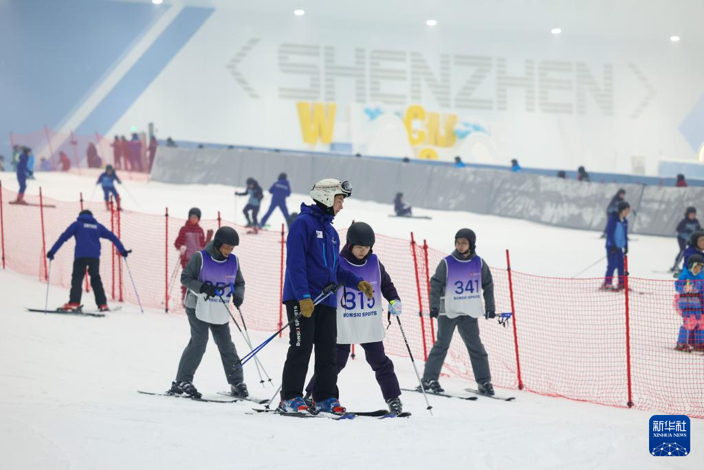 10月7日,在深圳·前海冰雪世界,滑雪爱好者在教练的指导下学习滑雪。