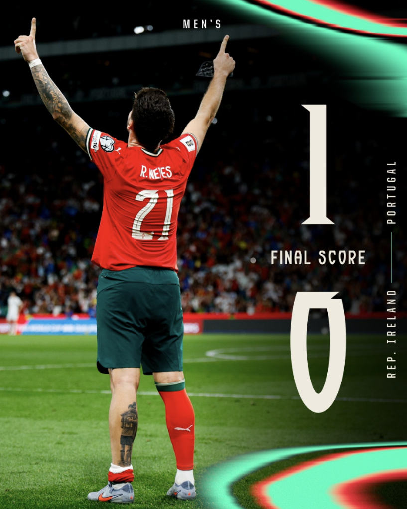 第17分钟,葡萄牙队迎来最接近破门的机会。克·罗纳尔多(C罗)禁区外远射,皮球击中立柱弹出;面对已经倒地的门将,伯纳多·席尔瓦补射偏出,未能把握良机。第75分钟,特林康起脚劲射,皮球击中爱尔兰队后卫手臂,主裁判判罚点球,但C罗主罚的点球被对方门将用脚挡出。场上僵局最终在补时阶段被打破——第91分钟,鲁本·内维斯接队友传中后头球破门,帮助葡萄牙队1:0绝杀爱尔兰队。