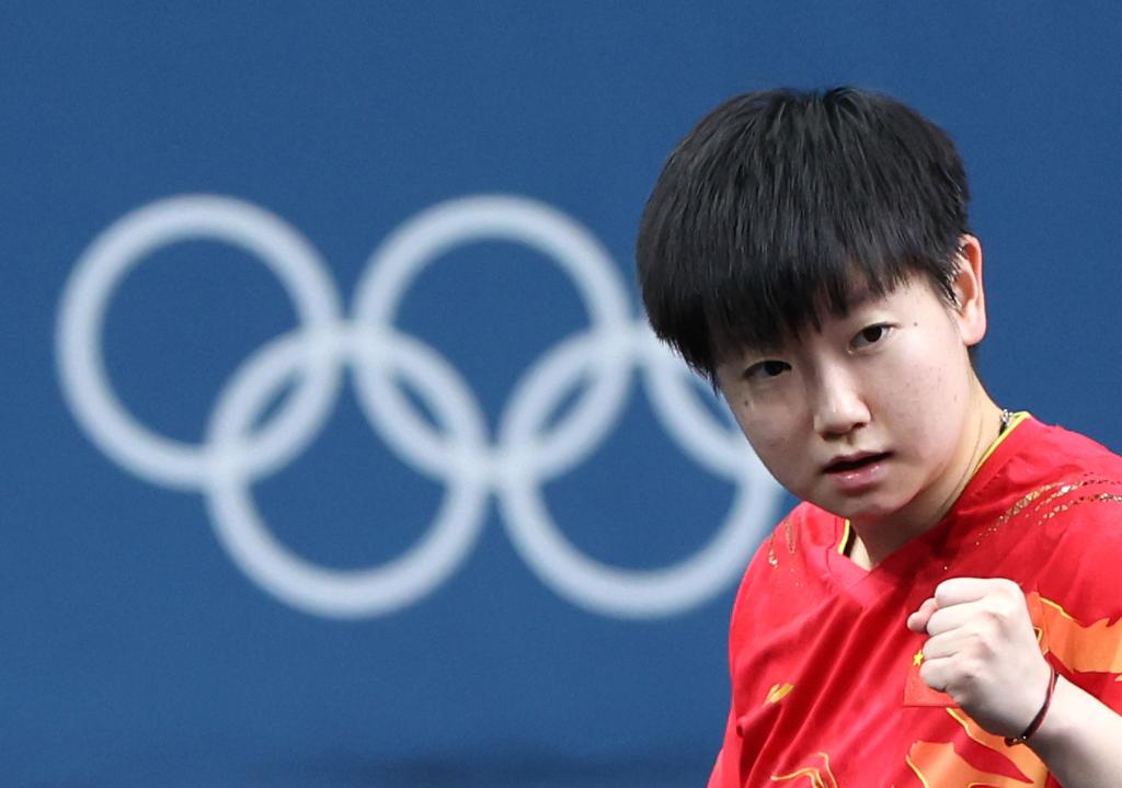 2024年8月10日,孙颖莎在得分后庆祝。当日,在巴黎奥运会乒乓球女团金牌赛中,中国队3:0战胜日本队,获得冠军。新华社记者 刘续 摄