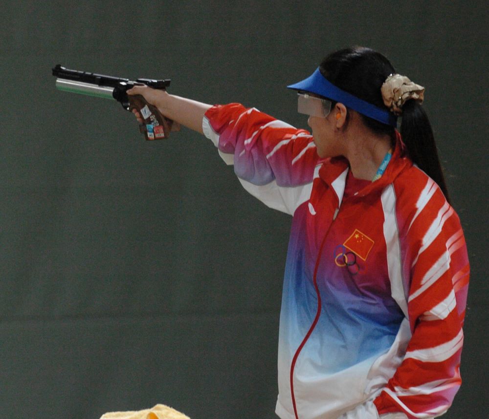 2004年8月15日,中国选手任洁在奥运会射击女子10米气手枪决赛中获第四名。图为任洁在比赛中。新华社记者 焦卫平 摄