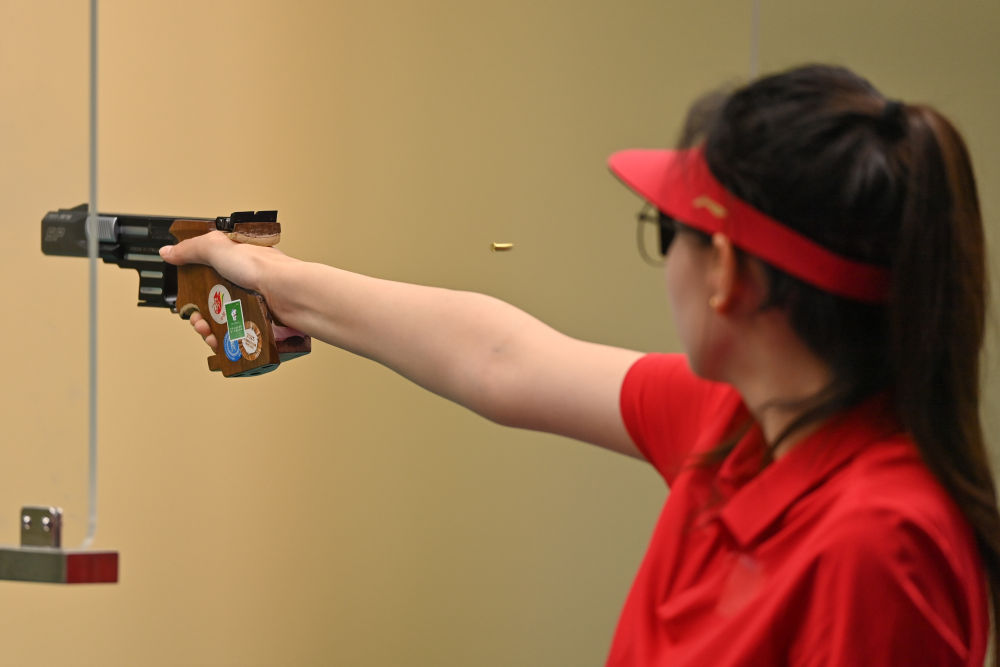 尽管桃桃的奖牌成色不如教练当年,但她的项目更具挑战。25米手枪,运动员需要承受的枪支后坐力是女子步枪和手枪项目中最大的,规则也最复杂,业内俗称“慢+速”。资格赛第一阶段打6组、每组5发“慢射”,5分钟内完成一组;第二阶段是“速射”,要在3秒内打出一发,连打5发为一组,打6组,按环数排名。决赛只打速射,10.2环及以上算命中,按命中数排名。