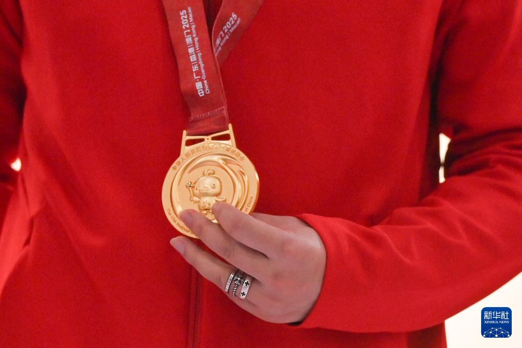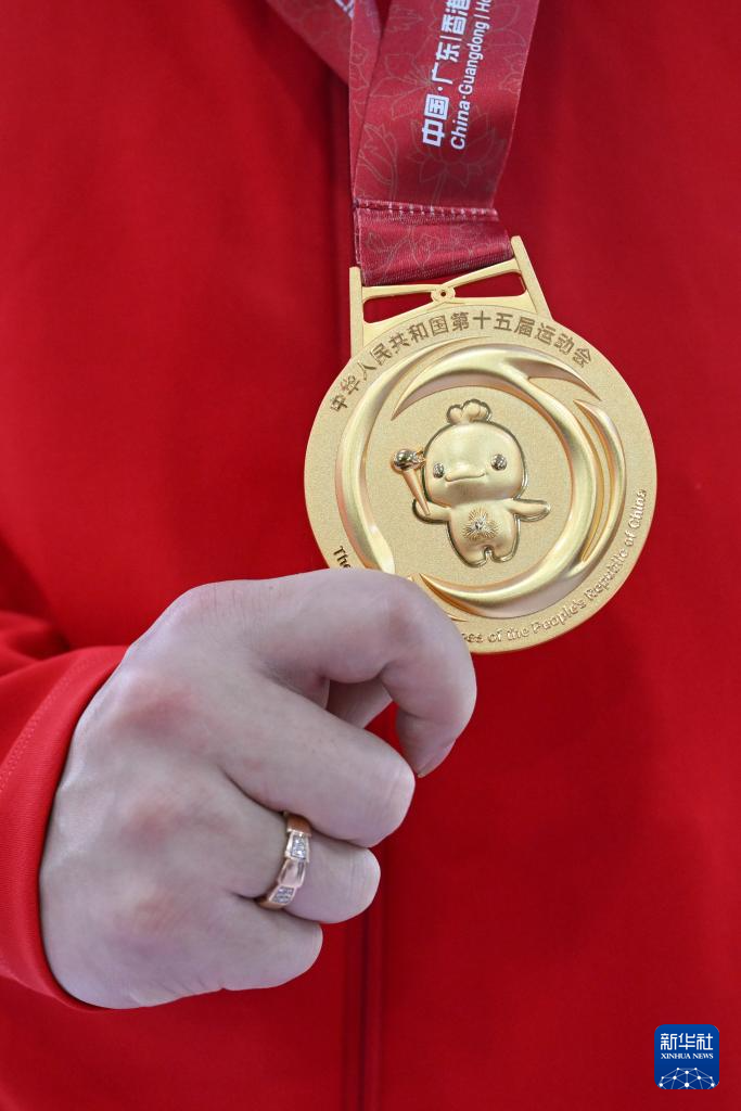 10月17日,获得冠军的陕西队选手刘宇坤展示奖牌。