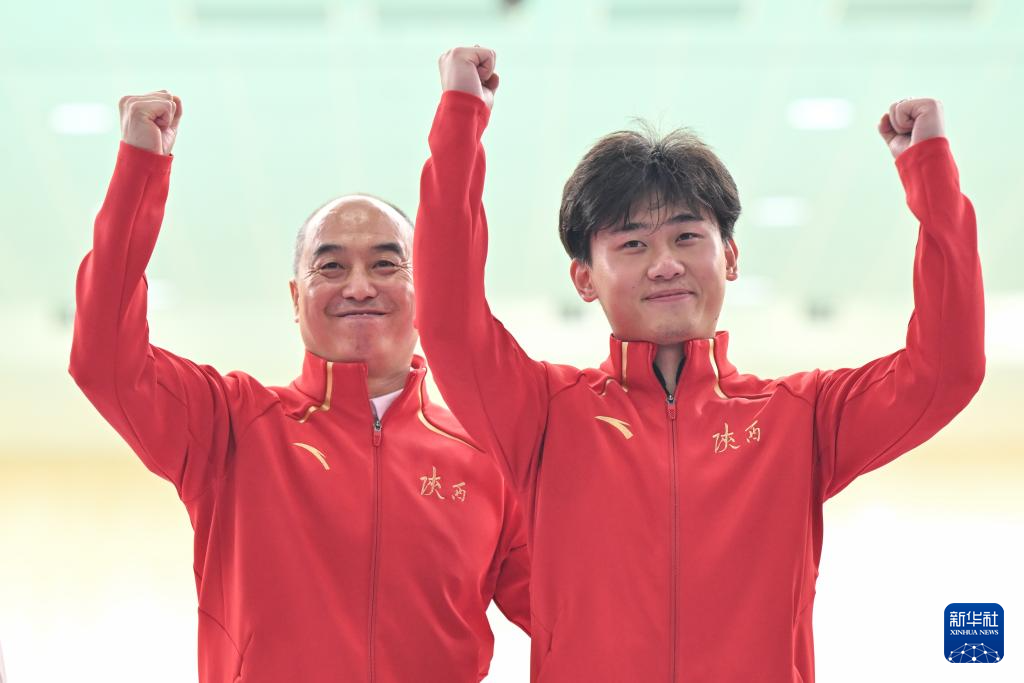 10月17日,冠军陕西队选手刘宇坤(右)和教练在颁奖仪式上。