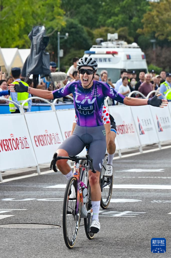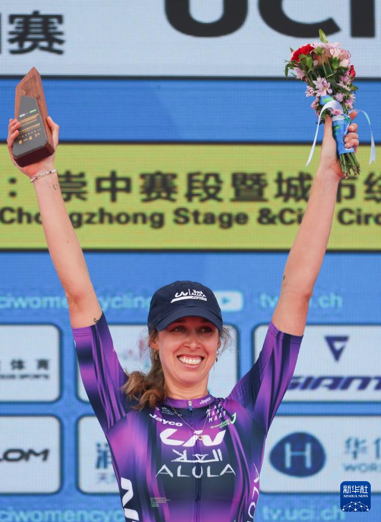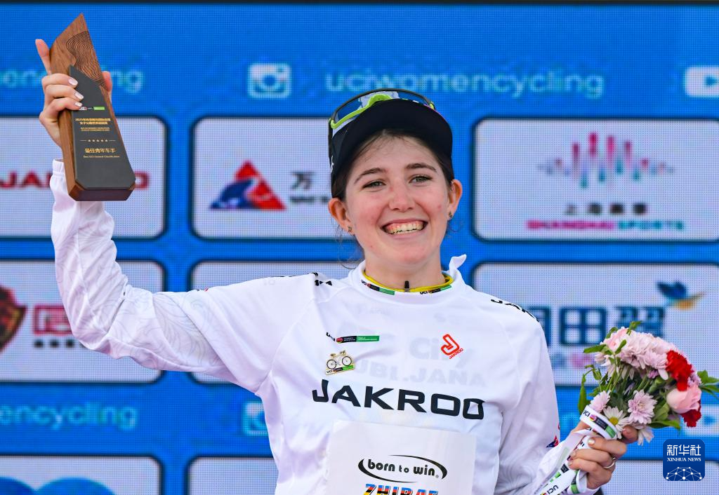 10月16日,BTC城市卢布雅尔那车队哈萨克斯坦车手斯克利亚罗娃身着代表最佳青年车手的白衫在颁奖仪式上庆祝。