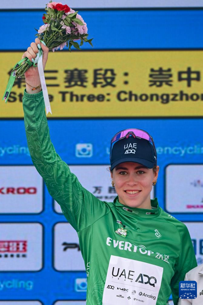 10月16日,阿联酋ADQ车队荷兰车手范·罗伊延身着代表冲刺总积分第一名的绿衫在颁奖仪式上庆祝。