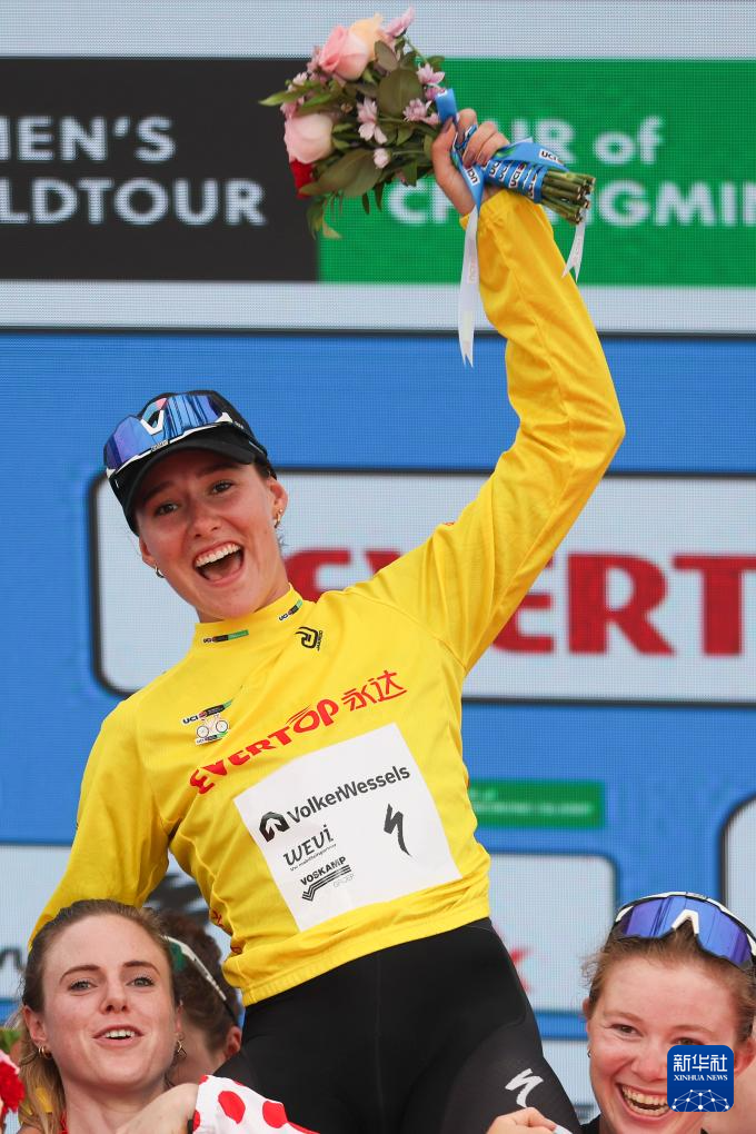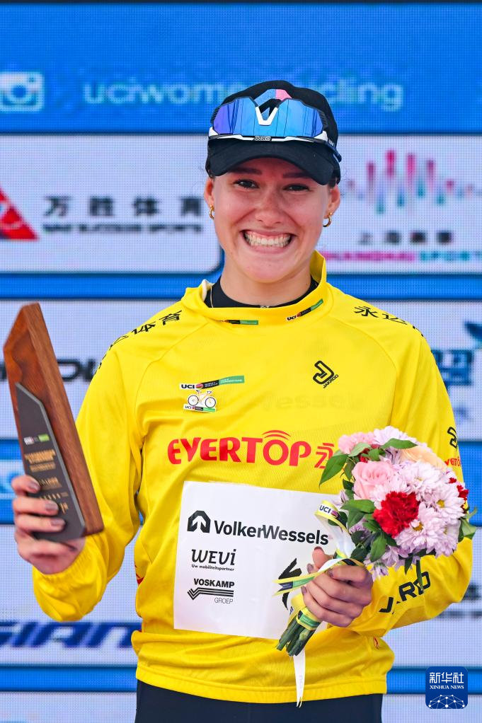 10月16日,瓦尔克韦塞尔斯职业车队荷兰车手克尼嫩堡身着代表总成绩第一名的黄衫在颁奖仪式上庆祝。
