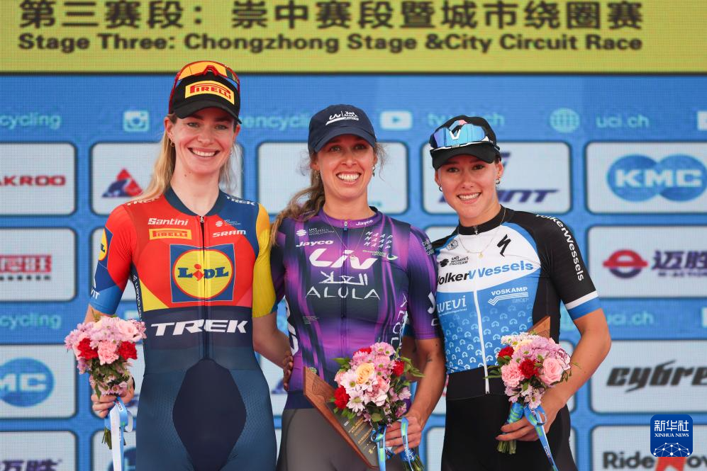 10月16日,赛段前三名丽芙-埃尔奥拉-杰科车队澳大利亚车手塔尔博特(中)、历德崔克车队荷兰车手马库斯(左)、瓦尔克韦塞尔斯职业车队荷兰车手克尼嫩堡在颁奖仪式上。