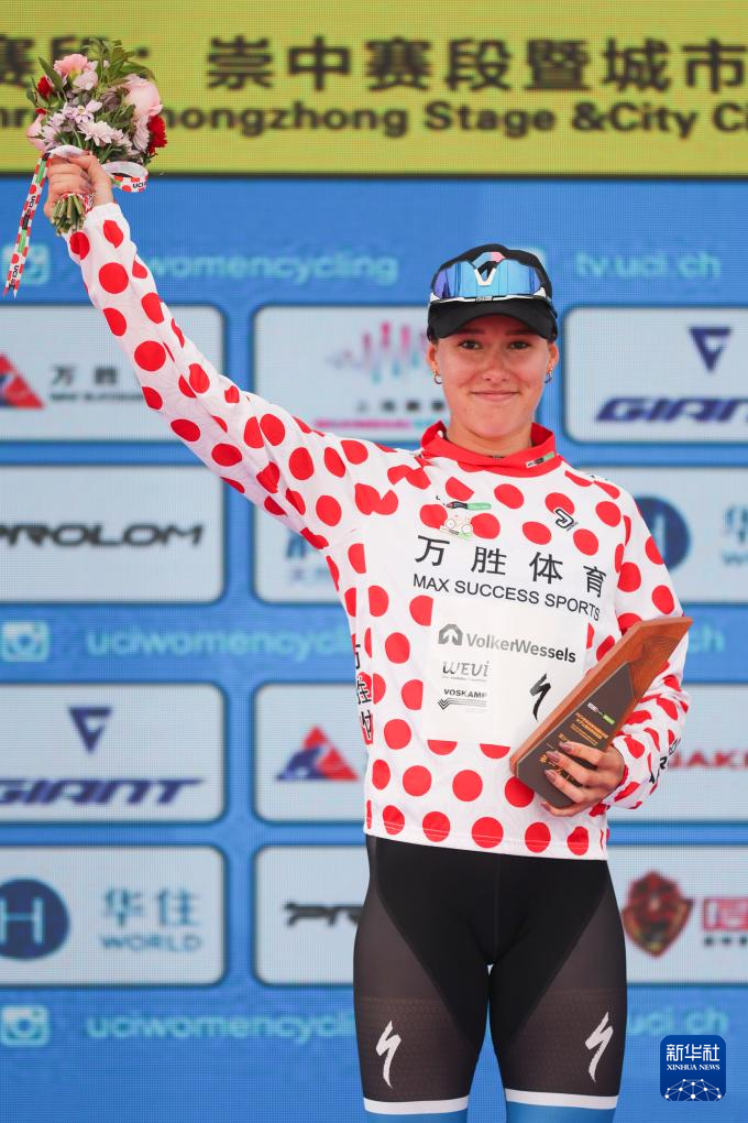 10月16日,瓦尔克韦塞尔斯职业车队荷兰车手克尼嫩堡身着代表爬坡总积分第一名的圆点衫在颁奖仪式上。