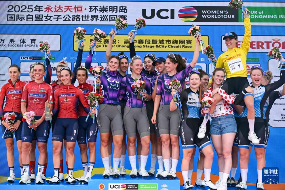10月16日,团体总成绩前三名丽芙-埃尔奥拉-杰科车队车手(中)、罗兰德沃卢伊车队车手(左)、瓦尔克韦塞尔斯职业车队车手在颁奖仪式上庆祝。