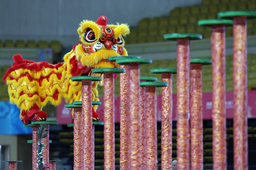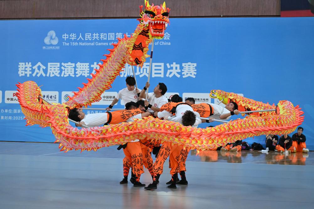 2025年11月11日,河南队在第十五届全运会群众展演舞龙舞狮项目南狮自选决赛比赛中。新华社记者 王鹏 摄
