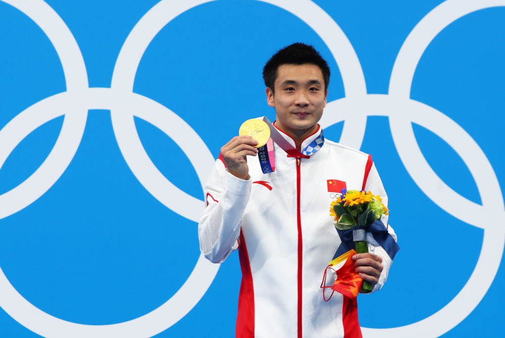 2021年8月7日,中国选手曹缘在颁奖仪式上。当日,在东京奥运会跳水男子10米台决赛中,中国选手曹缘夺得冠军。新华社记者 丁旭 摄