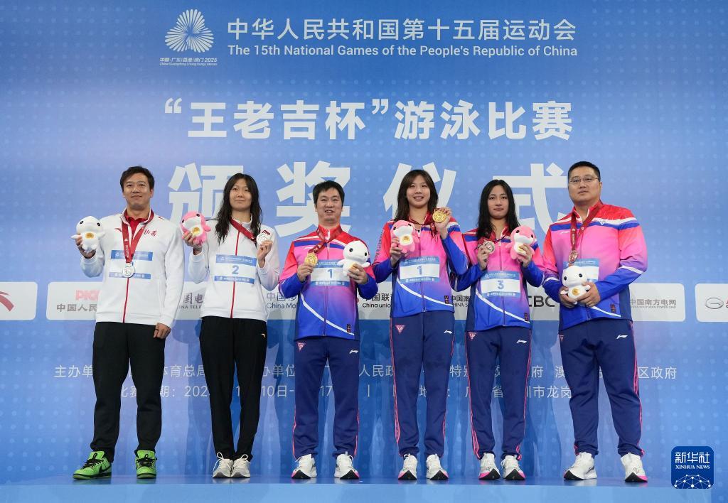 11月12日,冠军上海队选手唐钱婷(右三)、亚军山西队选手杨畅(左二)、季军上海队选手宋梓欣(右二)和教练在颁奖仪式上。