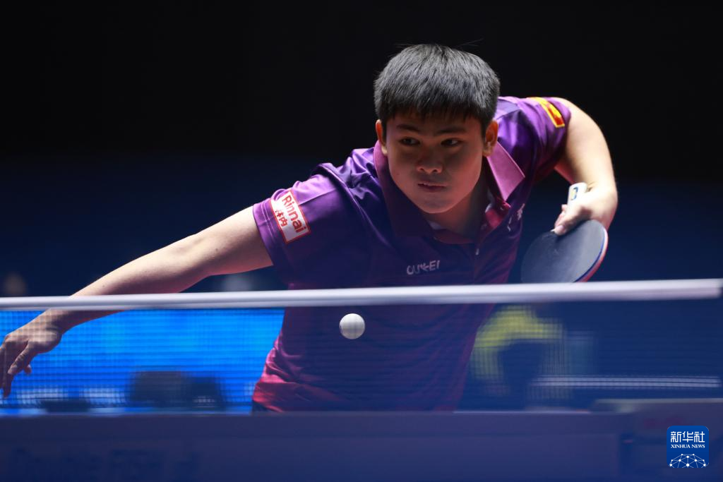 11月12日,广东队选手王栋在比赛中回球。