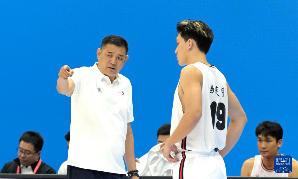 11月12日,山东队主教练巩晓彬(左)指导球员曲笑宇。