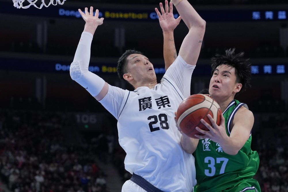 11月11日,广东队球员沈梓捷(左)在比赛中防守辽宁队球员李虎翼。新华社记者 李博 摄