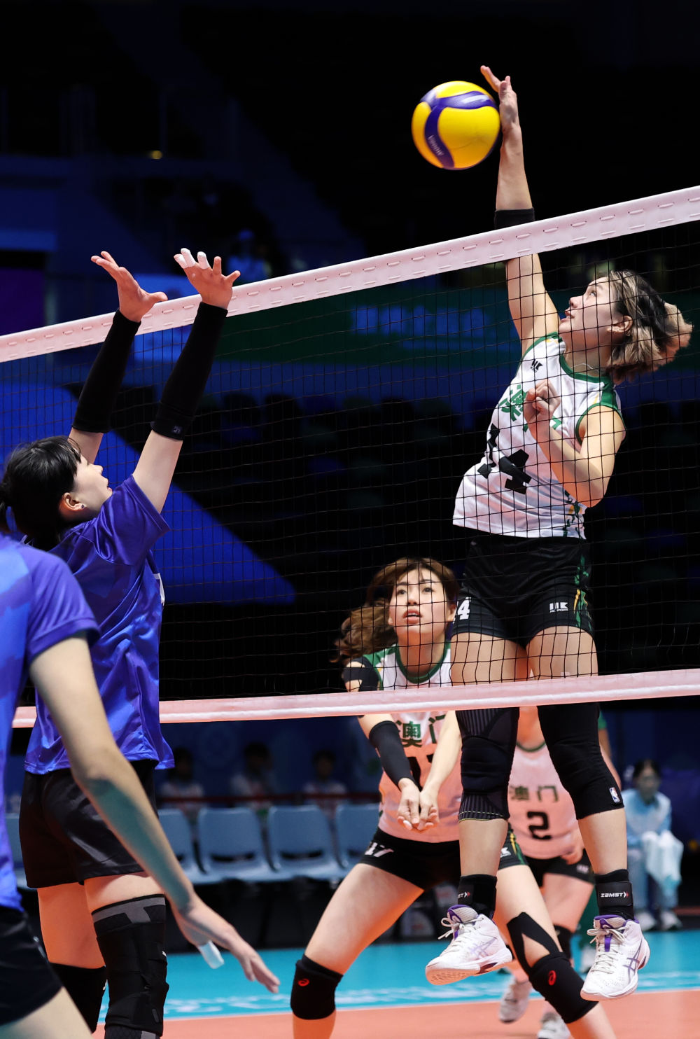 11月11日,澳门队球员甄语嫣(右)在比赛中进攻。新华社记者 孙凡越 摄