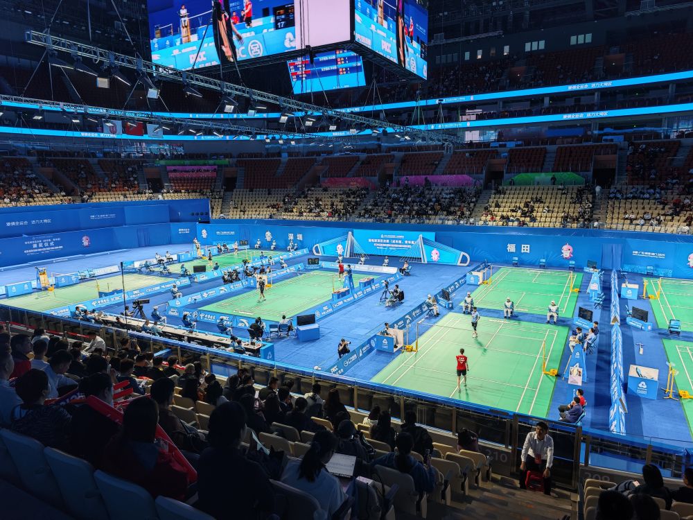 新华社深圳11月12日电(记者田光雨、孙飞、丁文娴)11日的十五运会羽毛球赛场,晚上10点还有多场比赛没有结束。看台上已有观众离开,助威声似乎小了一点,三位观众为香港队加油的声音愈加清晰。