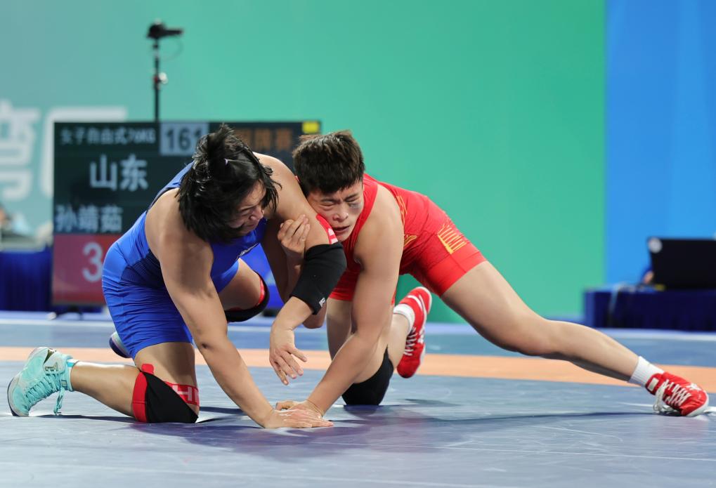2017年9月6日,在第十三届全运会国际式摔跤女子自由式75公斤级决赛中,湖南选手周倩战胜湖北选手许晴,获得冠军。新华社记者李贺摄