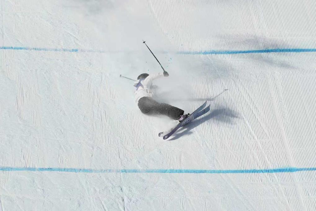 中国自由式滑雪运动员韩林杉在比赛中失误摔倒