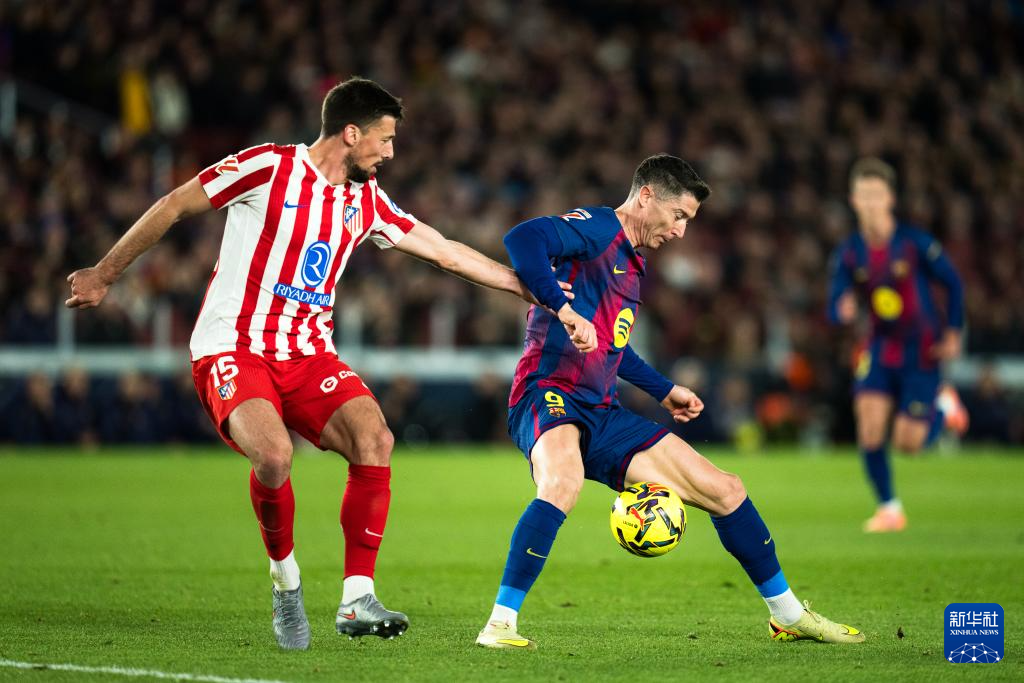 12月2日,巴塞罗那队球员莱万多夫斯基(右)与马德里竞技队球员朗格莱在比赛中拼抢。