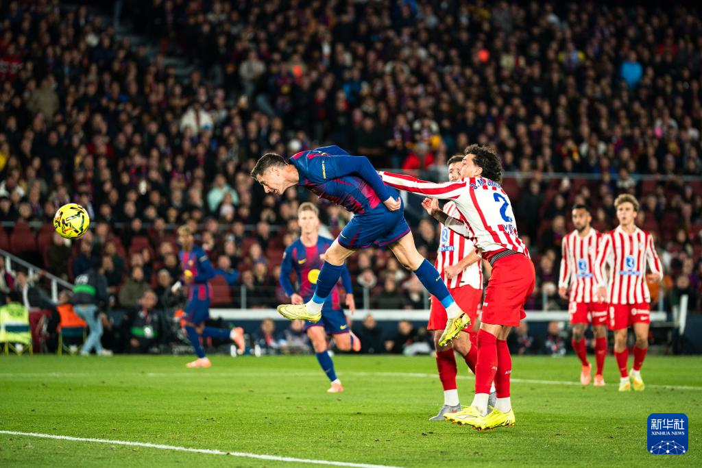 12月2日,巴塞罗那队球员莱万多夫斯基(左)在比赛中头球攻门。