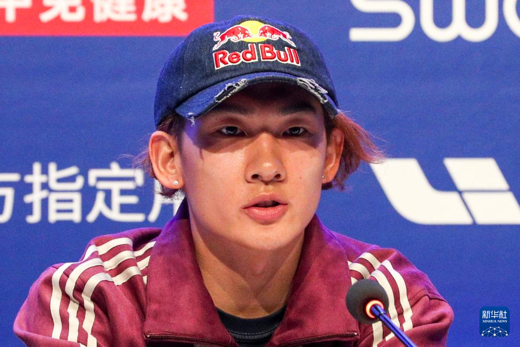 12月2日,中国单板滑雪运动员苏翊鸣在见面会现场回答记者提问。