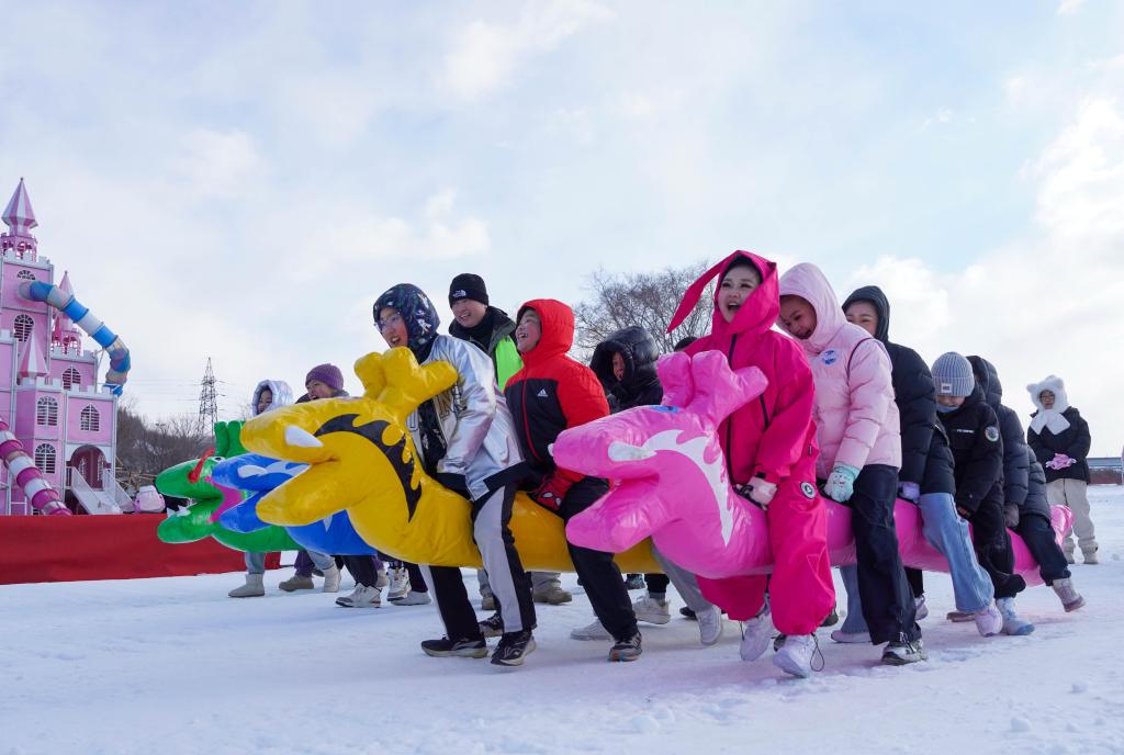 12月3日,吉林市中小学生在吉林市纳美山谷度假区参加“雪地龙舟”趣味活动。新华社记者 颜麟蕴 摄