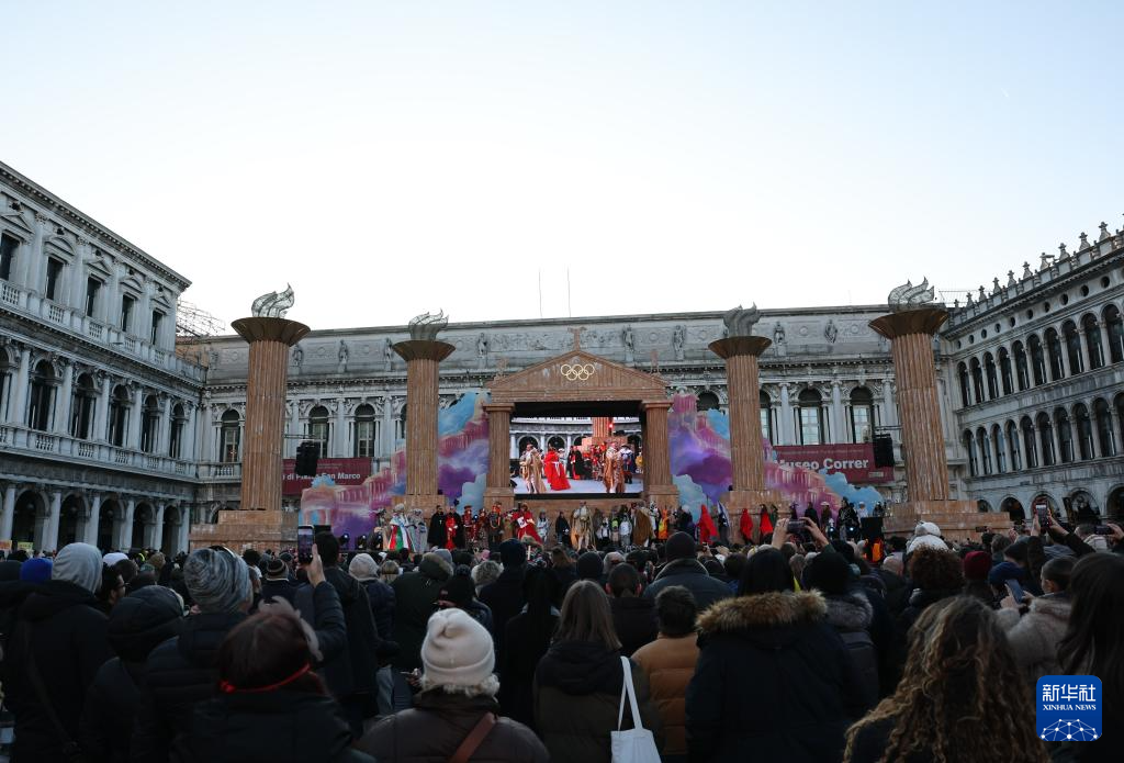 2月1日,在意大利威尼斯,人们在圣马可广场观看演出。狂欢节主舞台采用奥运主题造型。