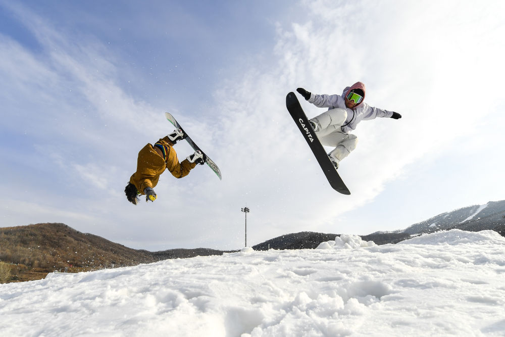 2022年11月19日,在吉林市万科松花湖度假区V-PARK地形公园,滑雪爱好者在跳台上练习。新华社记者许畅摄