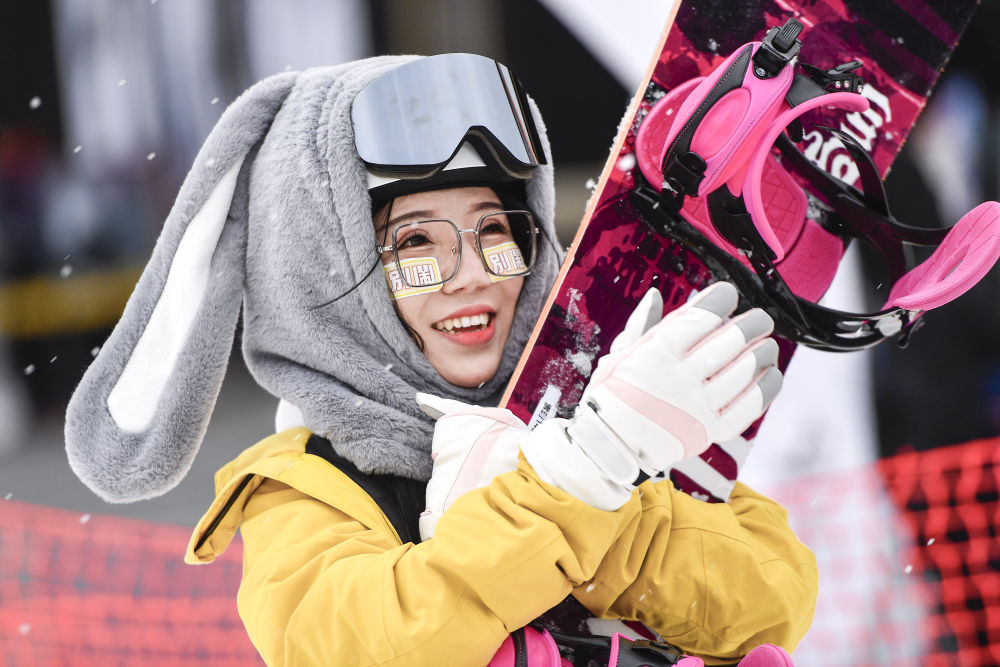 2022年11月19日,在第28届吉林国际雾凇冰雪节暨新雪季开板启动仪式上,滑雪爱好者在万科松花湖度假区滑雪场抱着滑雪板拍照留念。新华社记者 许畅 摄