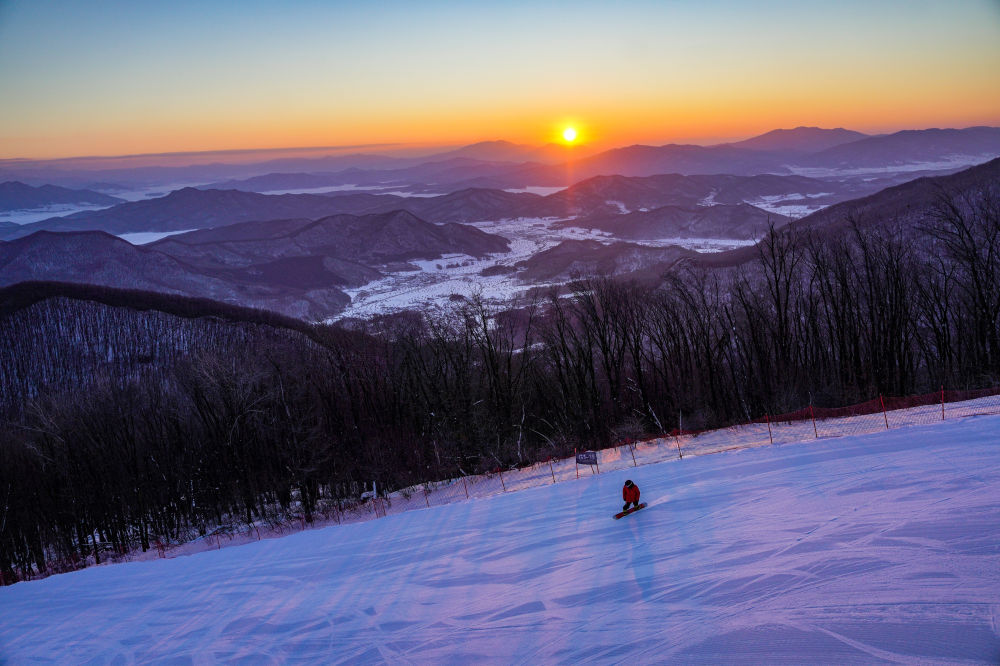 2023年1月1日,在吉林省吉林市万科松花湖度假区,滑雪爱好者在清晨的阳光下滑雪。新华社记者 颜麟蕴摄
