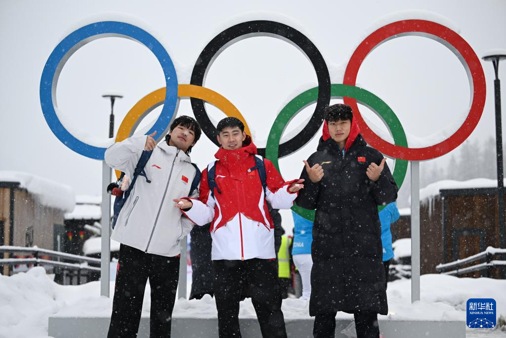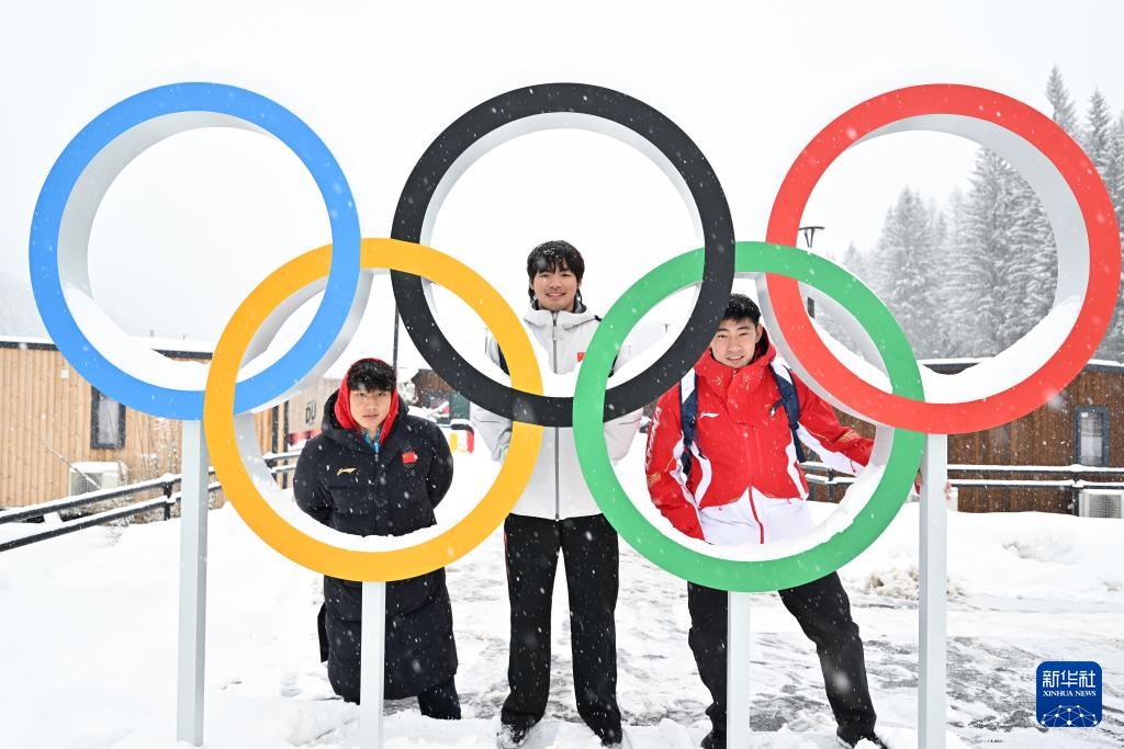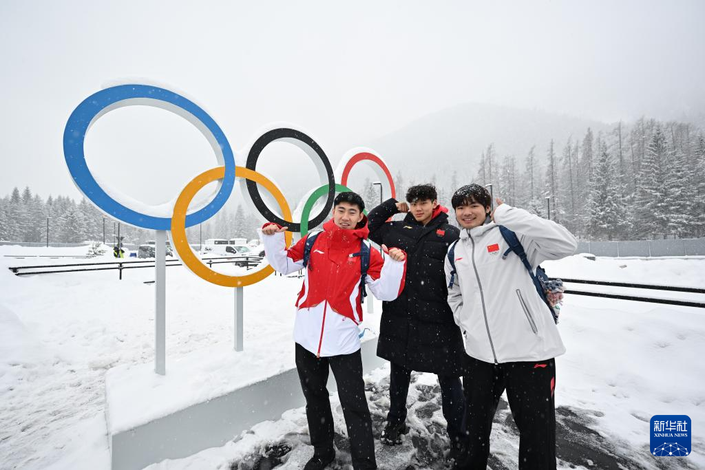 2月3日,在科尔蒂纳丹佩佐奥运村,中国雪车队运动员孙楷智、石曜隆、丁运达(从左至右)与奥运五环合影。