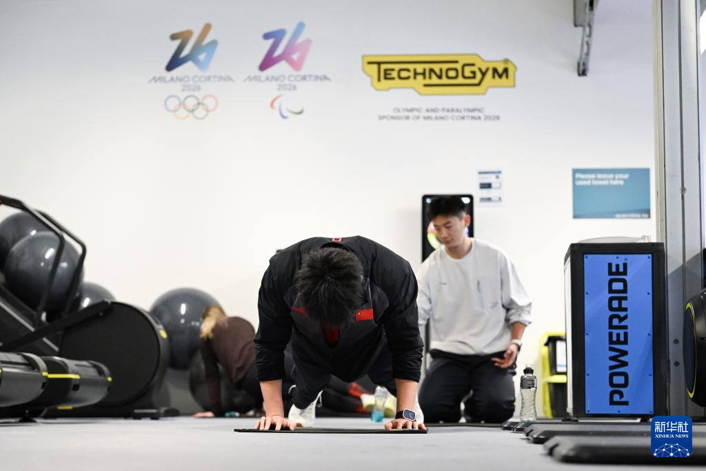 2月3日,在科尔蒂纳丹佩佐奥运村,中国雪车队运动员李纯键(前)在配套健身房内活动。