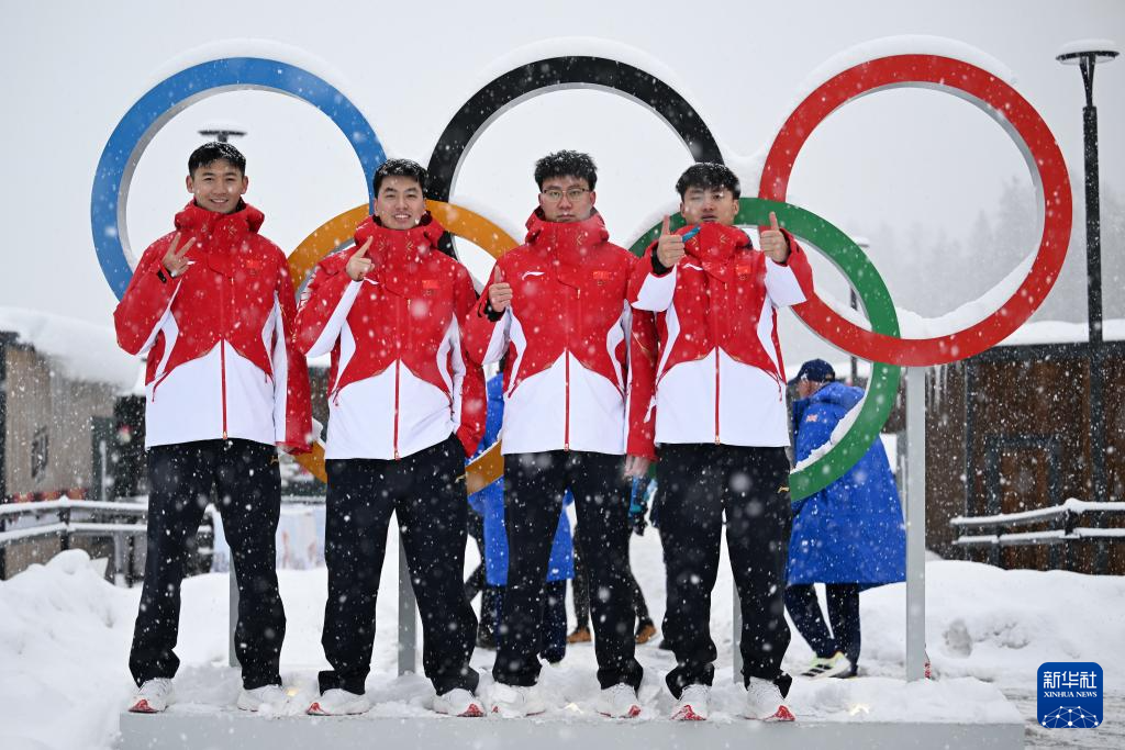 2月3日,在科尔蒂纳丹佩佐奥运村,中国雪车队运动员任建璋、姜茂源、李纯键、叶杰龙(从左至右)与奥运五环合影。