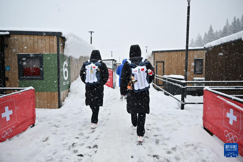 2月3日,中国体育代表团成员走在科尔蒂纳丹佩佐奥运村里。