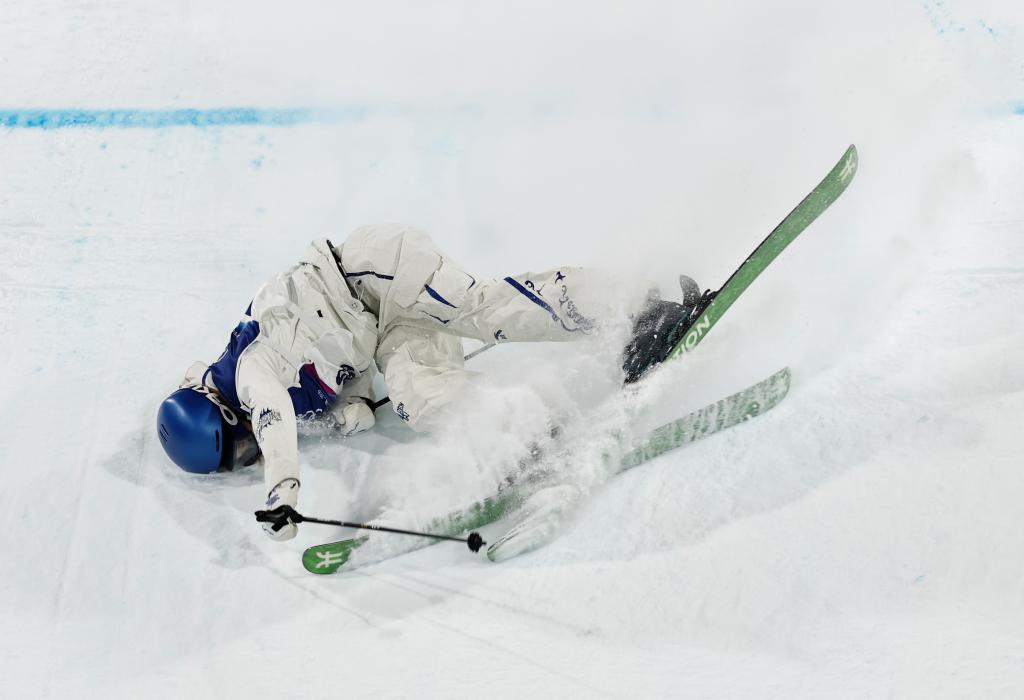 2月14日,中国选手谷爱凌在女子大跳台资格赛中摔倒。新华社记者 王鹏 摄
