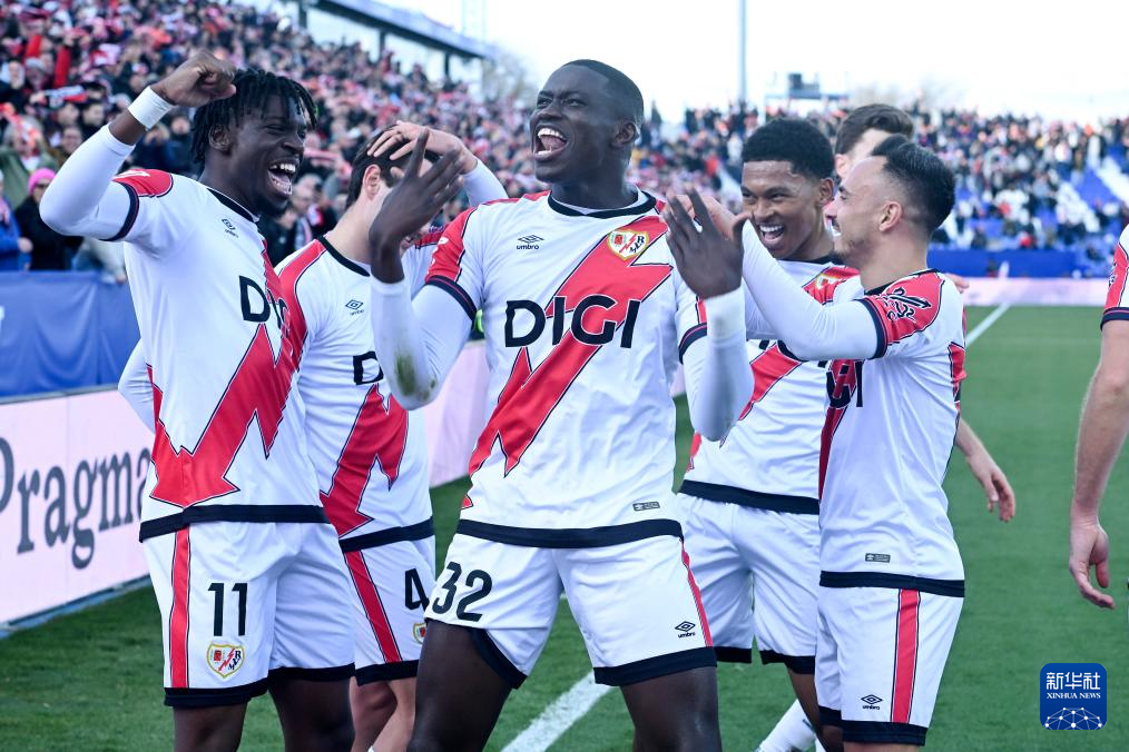 2月15日,巴列卡诺队球员诺贝尔·门迪(中)在比赛中庆祝进球。
