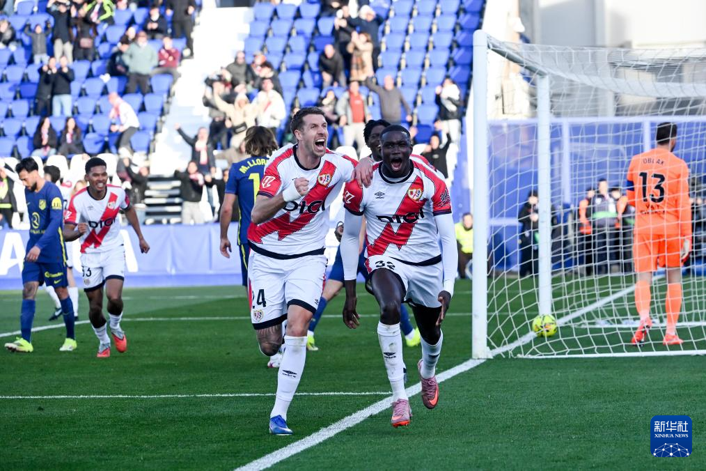2月15日,巴列卡诺队球员诺贝尔·门迪(左二)在比赛中破门得分。