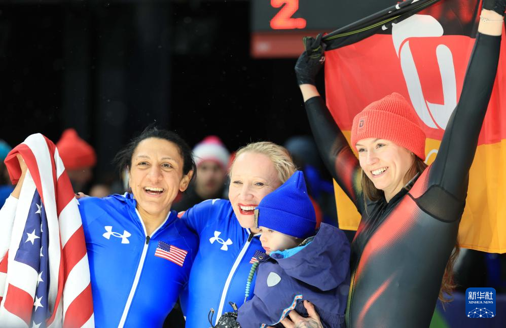 2月16日,冠军美国选手埃拉娜·迈耶斯·泰勒(左一)、亚军德国选手劳拉·诺尔特(右一)和季军美国选手凯莉·汉弗莱斯(左二)在比赛后合影。