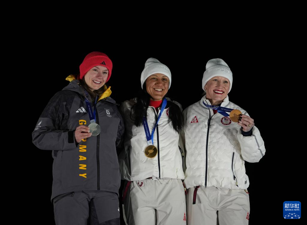 2月16日,冠军美国选手埃拉娜·迈耶斯·泰勒(中)、亚军德国选手劳拉·诺尔特(左)和季军美国选手凯莉·汉弗莱斯在颁奖仪式上合影。