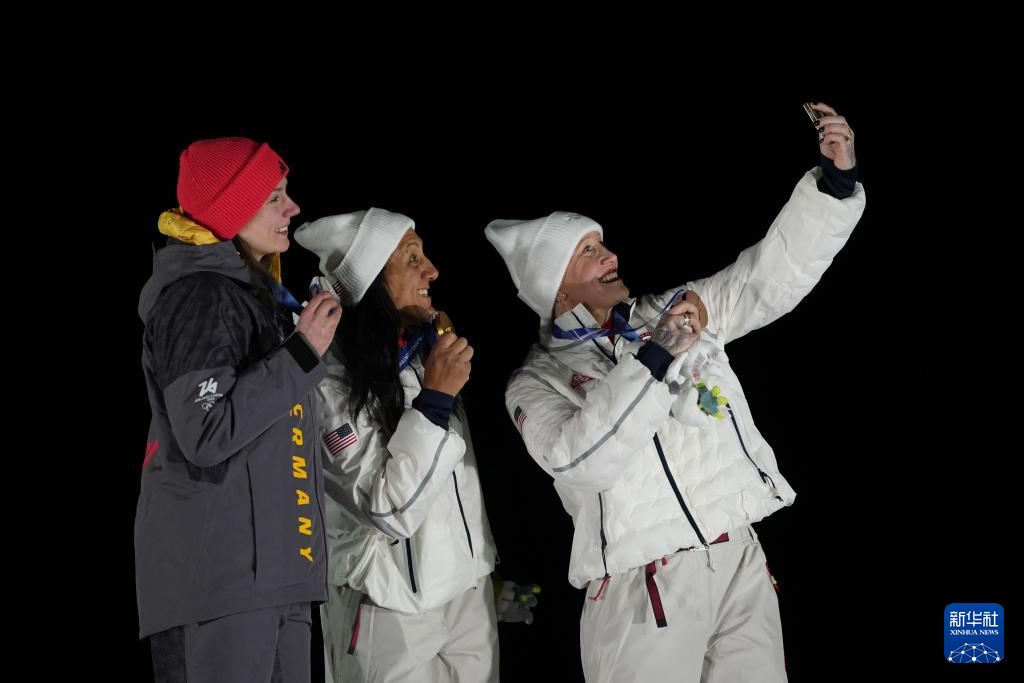2月16日,冠军美国选手埃拉娜·迈耶斯·泰勒(中)、亚军德国选手劳拉·诺尔特(左)和季军美国选手凯莉·汉弗莱斯在颁奖仪式上自拍。