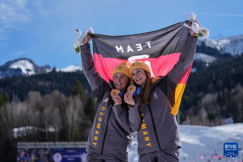 2月18日,季军德国队选手吉姆勒(右)、雷策克在颁奖仪式上。